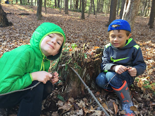 We made paths for tennis balls that Mrs. Cramer brought down to the woods. We made zig-zag trails out of sticks. Some people made jumps. Groups used different methods to stop the balls. One group made a hole at the end, another group used a pile of sticks. Other groups put a big piles of leaves, so when the ball hit the leaves it stopped in the leaves. We made zig-zags using sticks to help stop. Some groups made a tunnel out of bark.